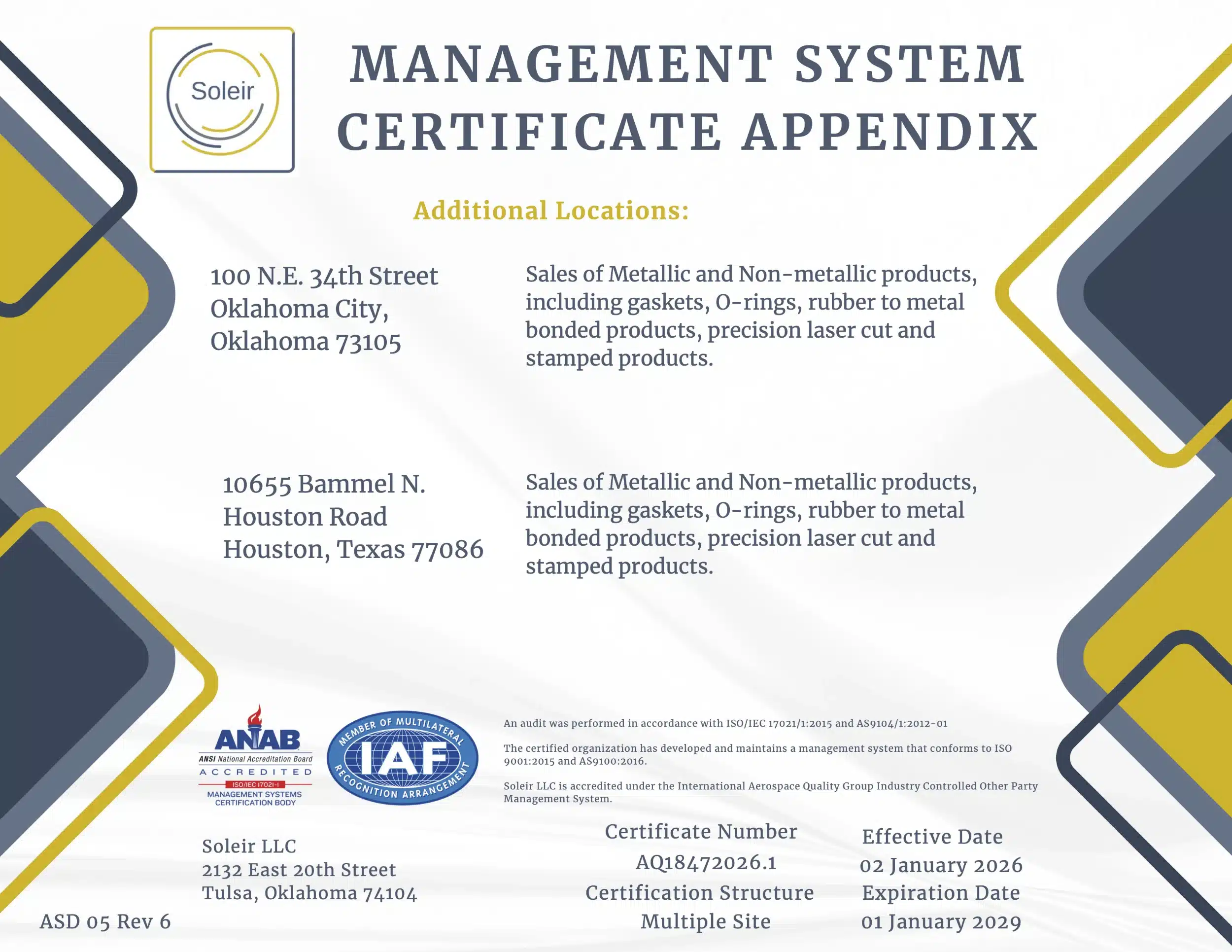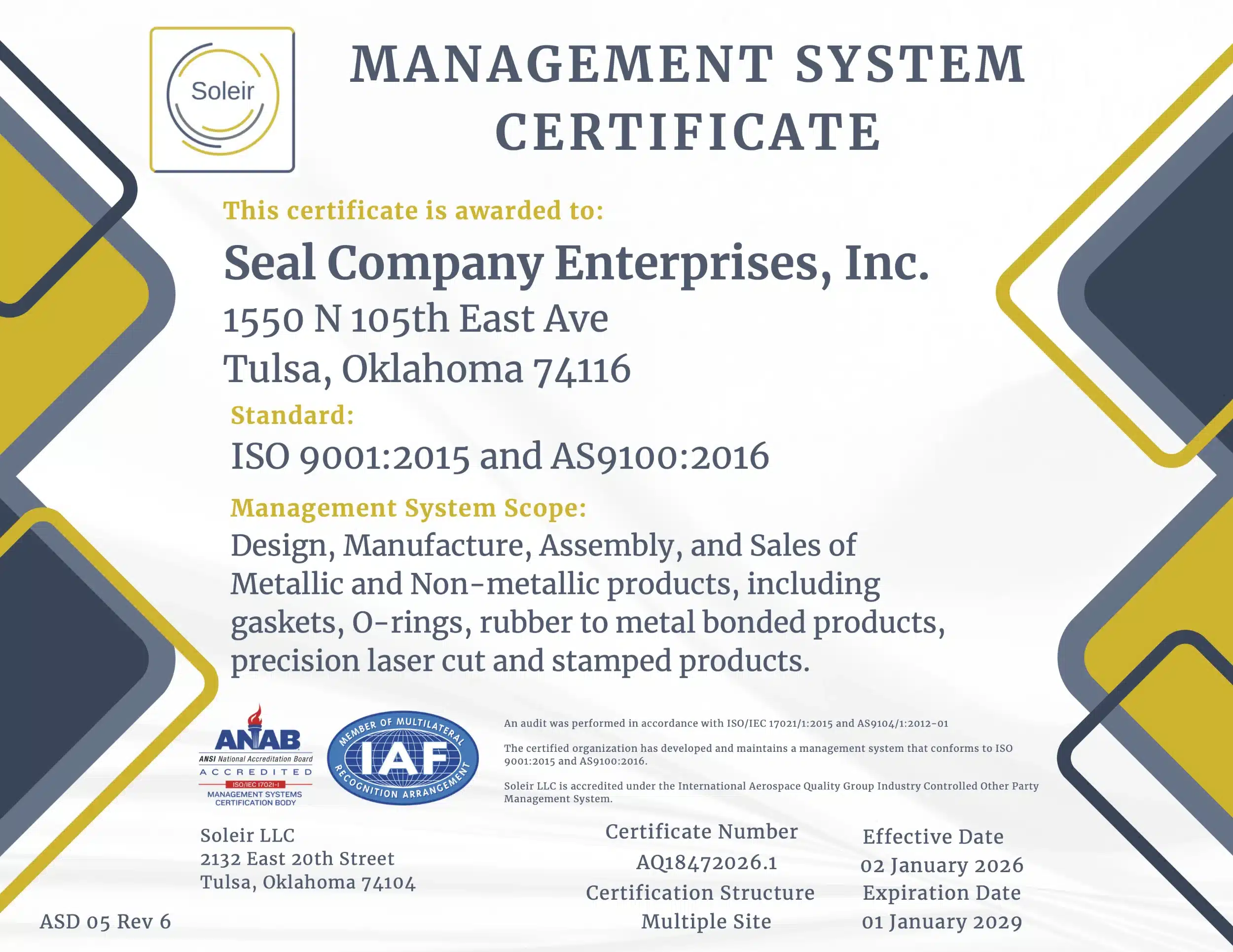 Seal Company Enterprises, Inc. meets or exceeds customer and company requirements, and strives for continual improvement of the QMS. Download our quality certificates by using the button below.